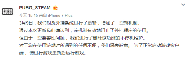 《绝地求生》开发商蓝洞,自3月8日停机更新反外挂措施以后,一直很忙!一会儿忙着紧急修复,一会忙着不停服更新;一会儿忙着告示游戏玩家需要卸载杀毒软件方可解决登录不上的问题。下午,蓝洞再次发出一则令人“震惊”的消息。消息内容如下:通过3月9日的反外挂系列的更新,有效地阻止了外挂程序的使用。但是,由于兼容性的问题,我们进行了删除该功能的不停机维护。