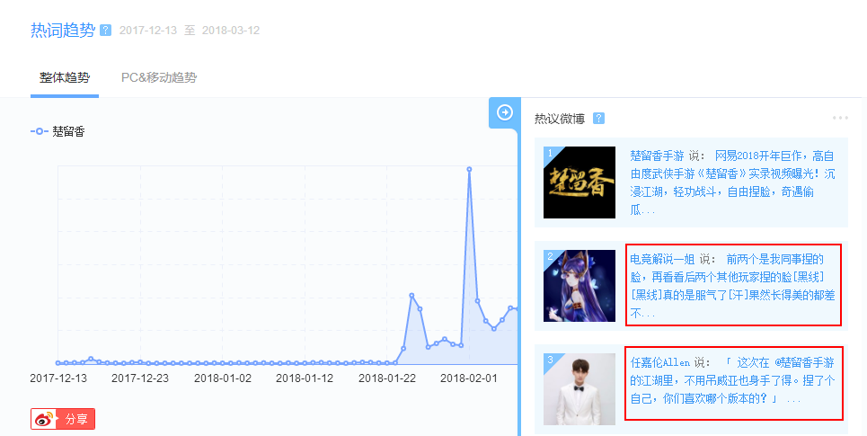 笔者也发现,现阶段《楚留香》评分下滑的另一个外在原因可能是新用户群体的涌入。《楚留香》初期可以迅速打开市场,社交媒体的营销也是比较重要的因素。从微博的情况来看,2月1日,“楚留香”的热词指数达到76671,“捏脸系统”、NPC剧情等都是玩家大多在讨论的内容。其中,热议中的女性用户群占比超过一半达到55.95%。