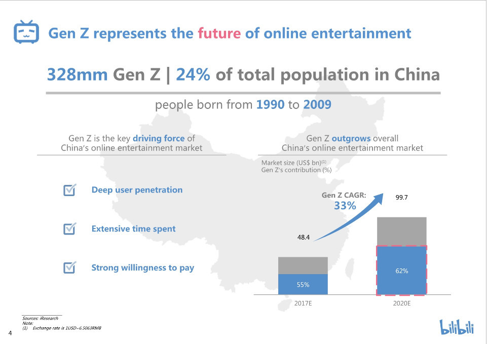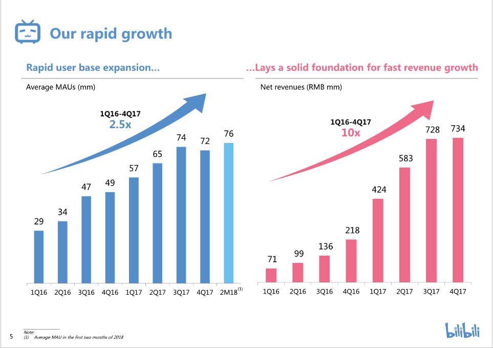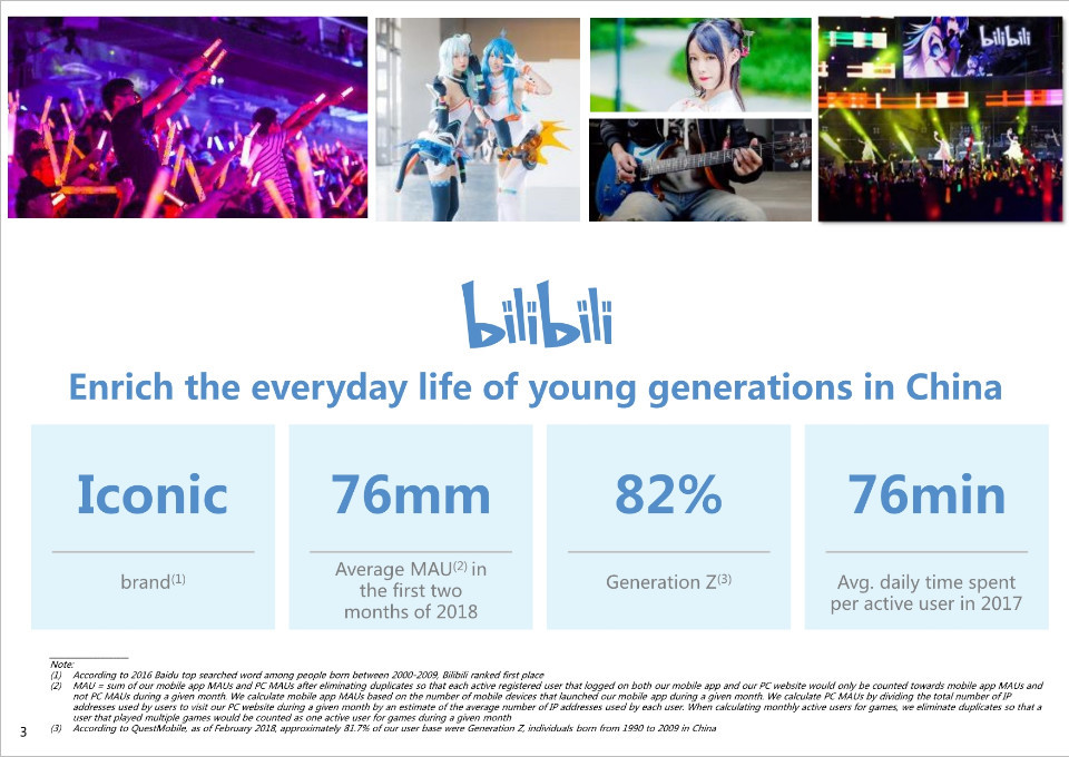 2018年前两个月平均月活跃用户(MAU)7600万,“Z世代”(1990年至2009年间出生)占82%,2017年每活跃用户在线时间76分钟。