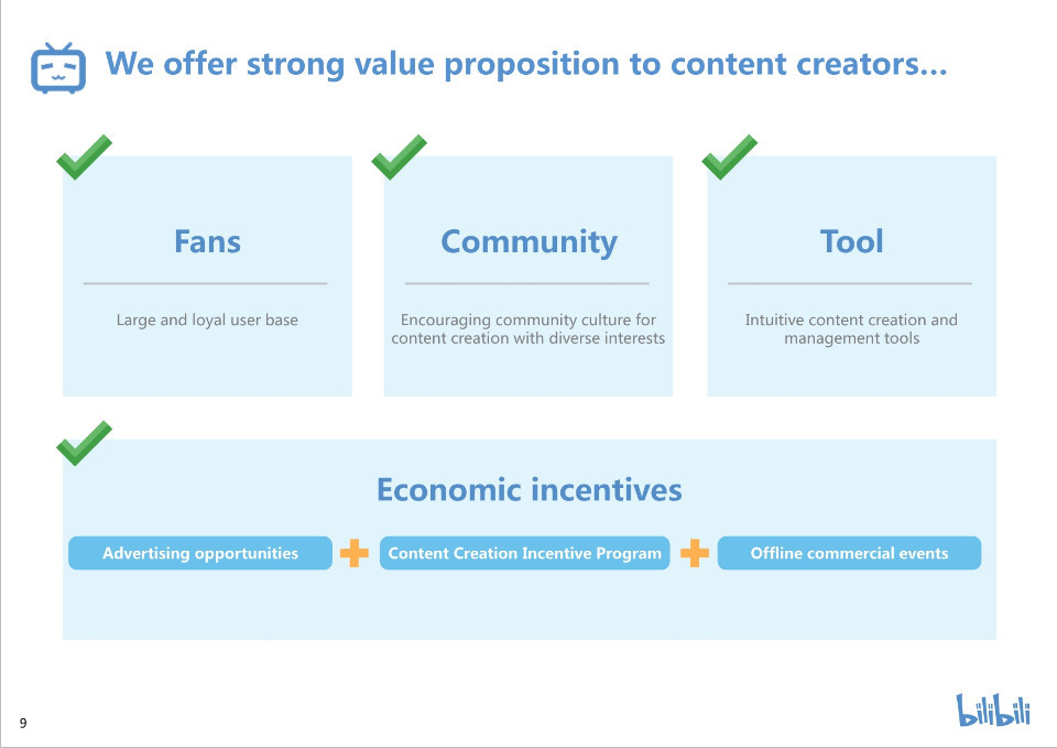 我们拥有大量忠诚的用户群,我们鼓励社区来创作不同类型的内容,并为他们提供内容创作和管理工具。与此同时,我们也向他们提供一些资助,包括广告机会,内容创造激励计划和线下商业活动等。