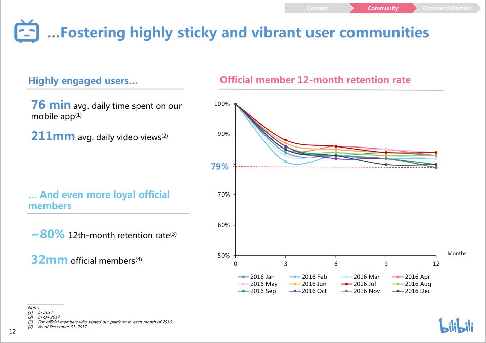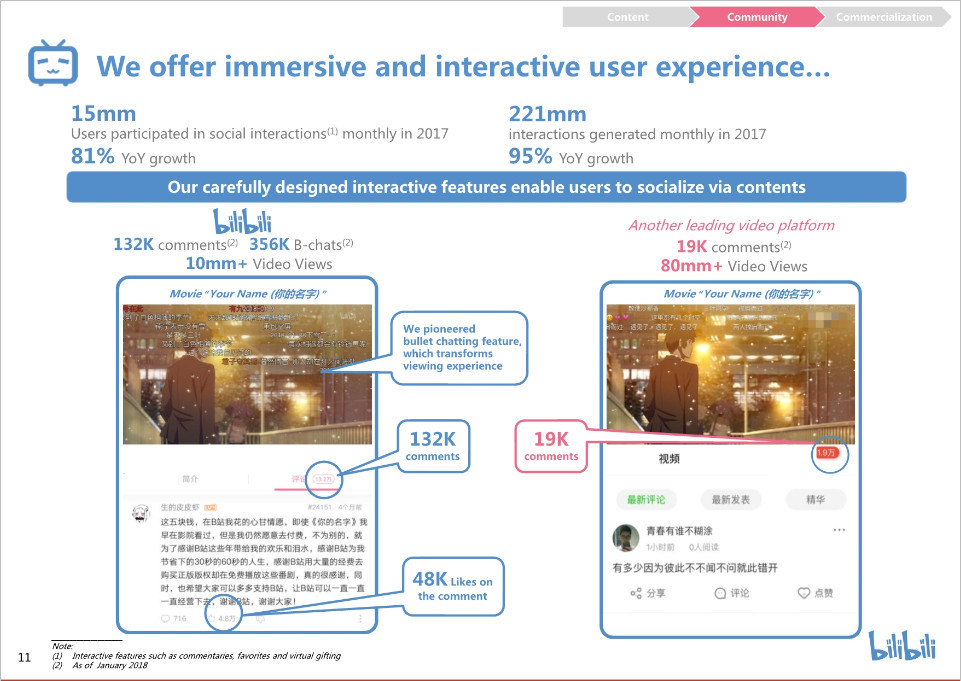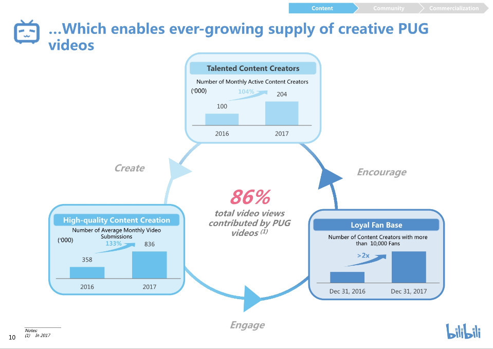 我们拥有高质量的内容创造,2017年平均月视频提交量为83.6万部,与2016年相比增长133%。