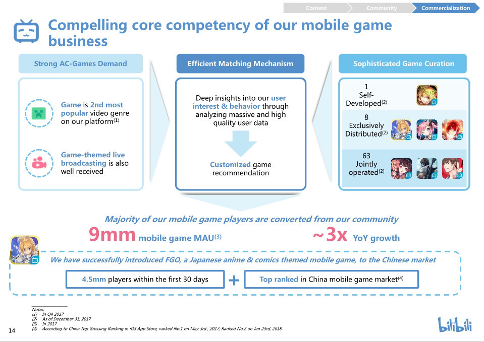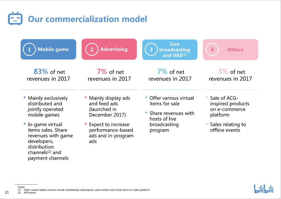 1)移动游戏;2)广告;3)直播和增值服务4)其他。2017年,我们83%的净营收来自移动游戏,7%来自广告,7%来自直播,剩余3%来自其他方面,如在电商平台上销售基于ACG灵感的产品。