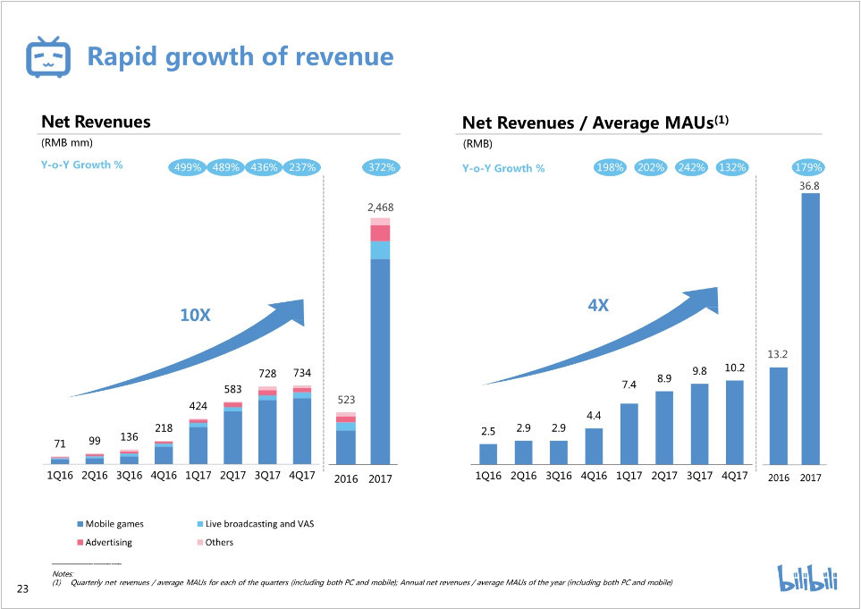 我们的平均月活跃用户数量增长迅速,2017年第四季度用户数量为2016年第一季度的2.5倍。与此同时,付费用户数量也显著增长,2017年第四季度付费用户数量为2016年第一季度的5.6倍。2016年每付费用户平均营收94元人民币,而2017年为185元人民币。