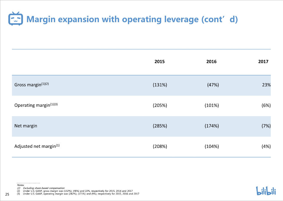 2015年毛利率为-131%,2016年为-47%,而2017年为23%。排名前三位的营收成本分别为收入分成、内容成本,以及服务器和带宽成本。2015年运营开支占净营收的73%,2016年占54%,而2017年占28%。