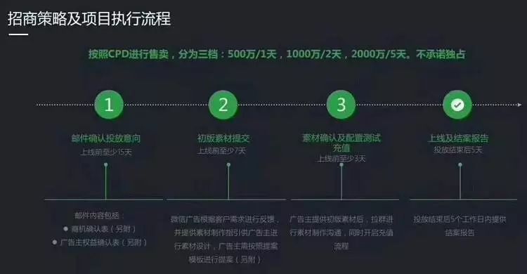 根据已经泄露的小游戏招商信息显示,腾讯小游戏广告按照CPD(Cost Per Day,按天计价)模式售卖,共分为500万1天、1000万2天、2000万3天三种方案。