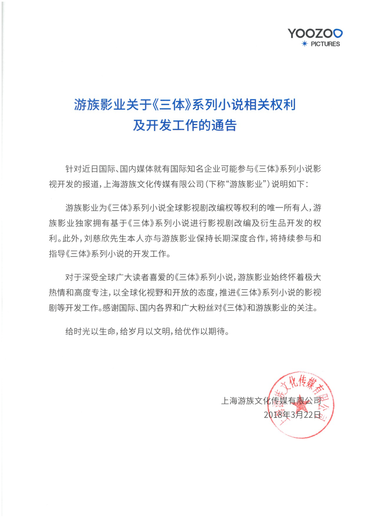 游族影业在通告中表示,对于深受全球广大读者喜爱的《三体》系列小说,游族影业始终怀着极大热情和高度专注,以全球化视野和开放的态度,推进《三体》系列小说的影视剧等开发工作,并在通告中感谢国内、外各界和广大粉丝对《三体》和游族影业的关注。