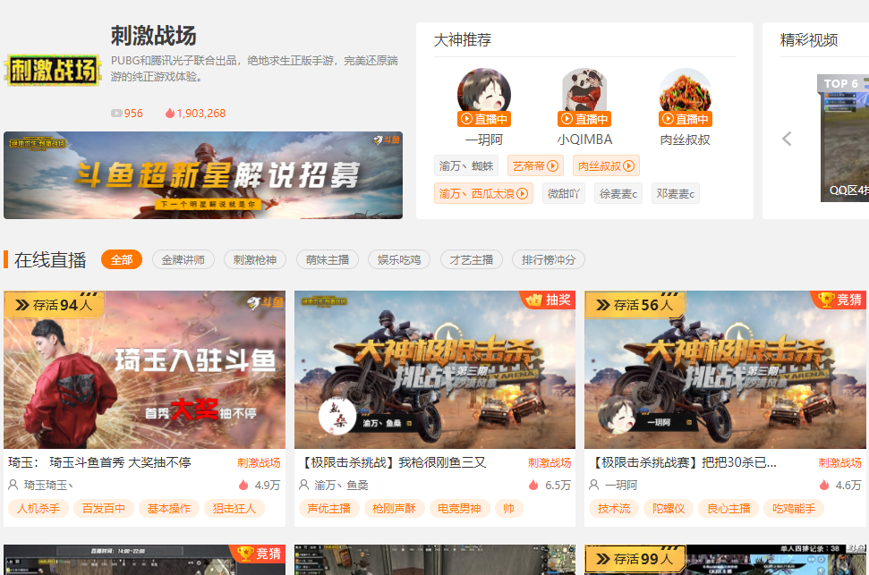 斗鱼直播平台做为国内多元化的优质直播平台,以其高品质的直播内容和众多闪耀光芒的主播,深受广大直播观众的喜爱和认可。在其诸多的直播分区版块内,各类手游直播成为人们关注的热点,绝地求生之刺激战场作为一款当下火热的战场竞技类手游之一,随着主播们的争相加入,逐渐发展成直播平台最受欢迎的直播内容之一。