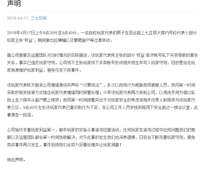 声明称,2018年4月17日上午8点30分至9点40分,一名自称玩家代表的男子在百合路三七互娱大楼内号称代表小部分玩家主张“权益”,期间做出拉横幅以及攀爬窗户等过激举动。