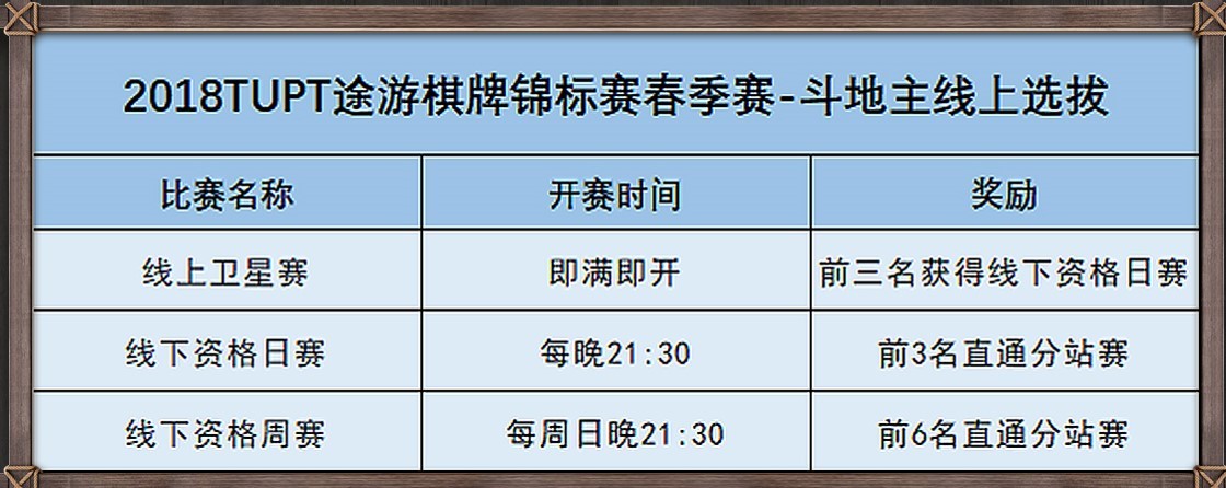 目前,2018TUPT春季赛三大赛区线上选拔赛已经相继开启。据悉,斗地主比赛在每一区域线上将产生72个名额晋级分站赛。4月12日至5月2日期间,北区用户可通过线上赛,向首站济南分站赛72个席位发起冲刺,同时,每一站分站赛前5名将直通2018TUPT途游棋牌锦标赛赛-斗地主总决赛。