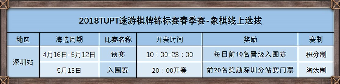 值得一提的是,4月16日至5月13日,象棋线上选拔赛也将开启。通过预赛及入围赛,将会有20名民间象棋高手来到深圳分站赛赛场,该站前10名也将直通到2018TUPT途游棋牌锦标赛赛-象棋总决赛。