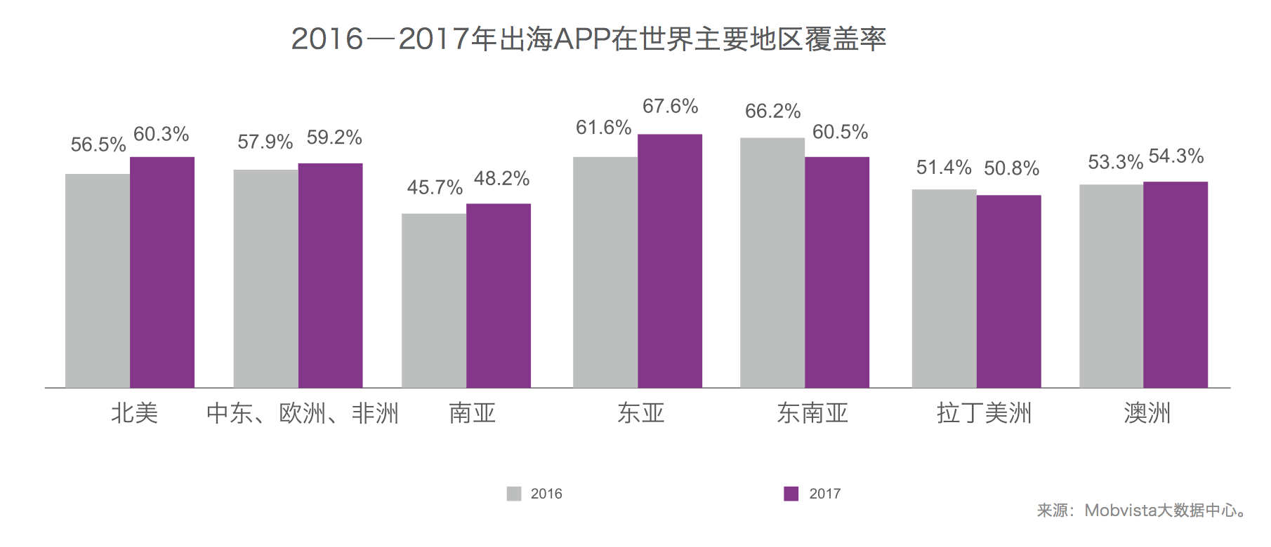 2017年东亚、北美和东南亚地区为出海企业的主要目的地,分别有67.6%、60.5%和60.3%的企业以此为目标。此外,通过对比2016年和2017年的出海方向,大多数地区覆盖率呈现上涨趋势,表明出海企业大多倾向于向多地区同步推广,且此行为有增强的趋势。主要地区中,东南亚为APP出海发展较早的市场,竞争逐渐激烈,出海开发者逐渐尝试向竞争空间更大的其他区域市场推广,虽有下降,但仍然是出海开发者重视的区域市场。
