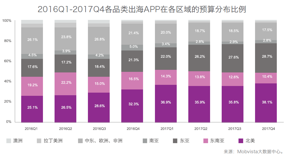 出海APP的广告投放与覆盖地区有很大的共性,在2016-2017年出海广告主营销金额地区分布中,北美洲、东亚是投放重点,2017Q4占比分别为38.1%和28.7%。报告中指出,东亚及北美洲均为经济条件较为发达地区,单位获客成本较高,且用户付费习惯良好,投资回报率也相因较高。