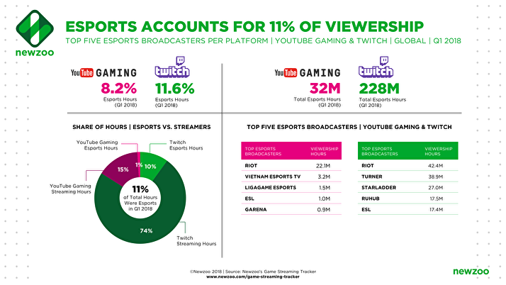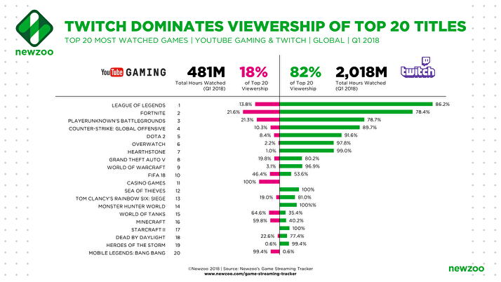 在2018年第一季度,YouTube游戏频道和Twitch的总观看时间分别为4亿小时和20亿小时。