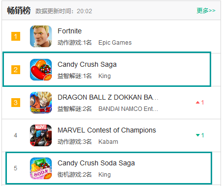 这些三消产品的突围也向我们表明了,即使是轻游戏,做到TOP领域同样能够和重度游戏抗衡,拿下高额流水和市场份额。比如在美国市场,“三消王”King的两款三消游戏长期稳居App Store畅销榜TOP5,力压一众重度手游。