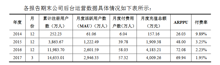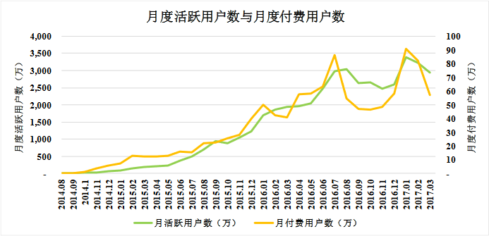 巨资宣传带来的人气非常可观,积累了大量的用户资源。同时数据表明,推广期间MAU与月付费用户数也表现出一定的联动性,在2016年7月至8月、2016年12月至2017年2月这两个时间段内,MAU与月付费用户数增长明显。