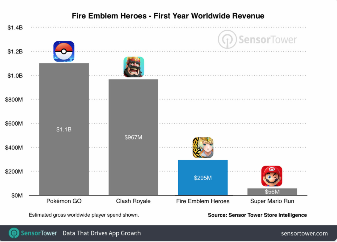 目前,任天堂旗下的移动游戏阵容包括,由Niantic研发的AR游戏《精灵宝可梦Go》以及DeNA研发的《超级马里奥Run》《火焰纹章:英雄》《动物之森:口袋营地》。根据SensorTower的数据,《火焰纹章:英雄》在移动平台发布的首年总收入达到了2.95亿美元,这个数字几乎是《超级马里奥Run》的五倍。