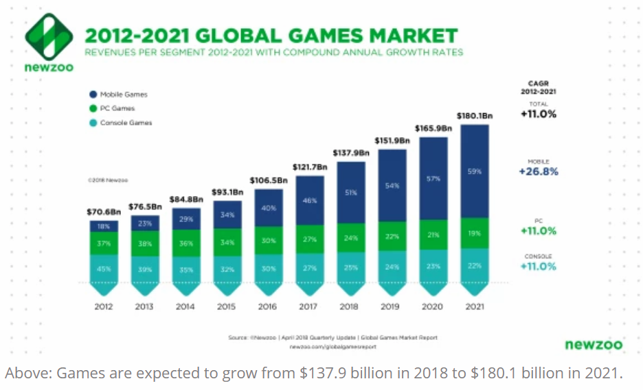 近日,市场研究机构Newzoo发布了一份全球游戏市场报告。该报告预测,2018年,全球游戏市场收入将达到1379亿美元,到2021年则有望突破1801亿美元,复合年增长率为10.3%