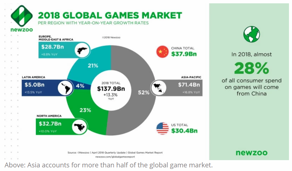 亚太地区是全球游戏行业持续增长的主要推动力,这只要是因为印度和东南亚等新兴市场的智能手机用户数量呈指数增长。同时,在较为成熟的移动游戏市场(中国和日本),玩家的付费意愿也不断增强。