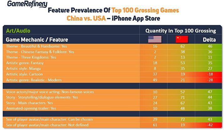 GameRefinery还发现,高质量的游戏配音和开场界面在中国移动游戏中非常受欢迎。但这两种素材会导致游戏包体增大,通常大的游戏包体在西方并不受欢迎。此外,这些元素在游戏中的使用寿命很短,西方的开发者更倾向在游戏中运用可以不断重复使用的素材,以降低开发成本和开发时间。