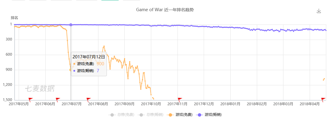 以欧美SLG大厂MZ的《战争游戏》为例,这款游戏已经上线将近五年。从近一年的游戏免费榜和畅销榜排名曲线来看,自2017年7月免费榜排名开始下跌之后,《战争游戏》的营收也持续下滑,目前保持在畅销榜TOP100左右。