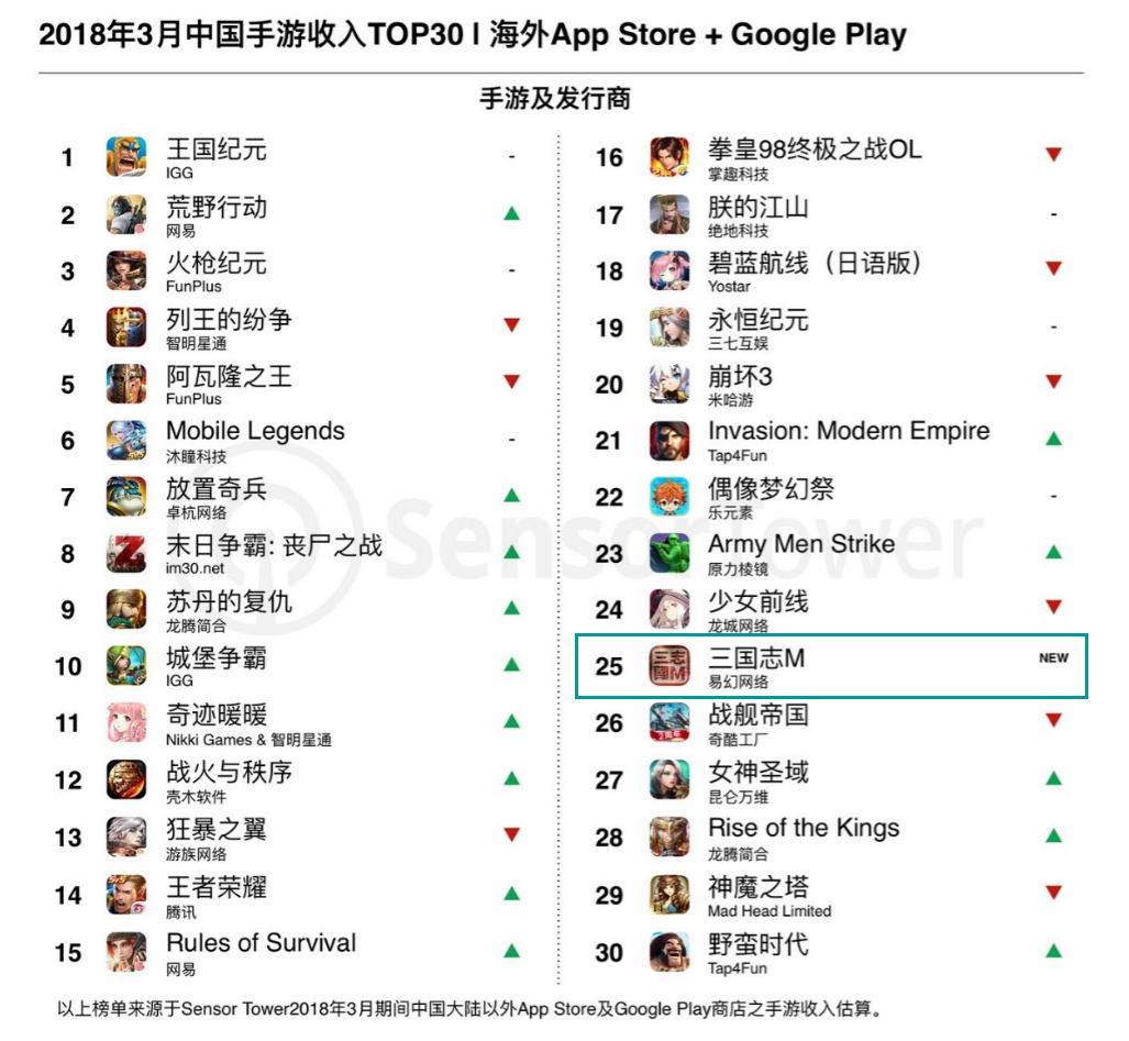 作为全球通吃的游戏类型,SLG一直是中国游戏厂商的出海首选。从SensorTower发布的3月中国手游出海收入TOP30来看,上榜的SLG游戏占据了榜单半壁江山。