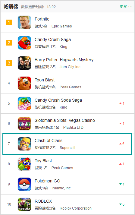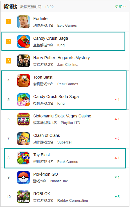在5月8日的美国App Store游戏畅销榜TOP10中,休闲游戏一共有5款。“三消王”King的《糖果传奇》和《糖果苏打传奇》吸金能力惊人,分列第2名和第5名。Peak Games的两款“三消”《Toon Blast》和《Toy Blast》的表现也相当好,分列第4名和第8名。