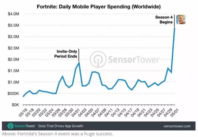 从2017年下半年开始,“吃鸡”这一品类开始爆发,“吃鸡”之风也从PC端蔓延到移动端上。率先在“吃鸡”玩法上做出差异化的《堡垒之夜》,在3月16日推出移动端之后迅速拿下了美国App Store双榜第一,至今仍未曾跌出畅销榜TOP5。据SensorTower统计,目前《堡垒之夜》iOS版本收入已经超过5000万美元。
