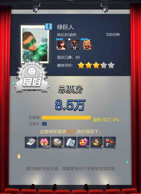 总括而言,《票房大卖王》的成功源于它把一个市场上稀缺的题材,巧妙放在了一个切合的玩法模式上,让玩家既能获得新鲜感的同时,也能对游戏的玩法保持兴趣。