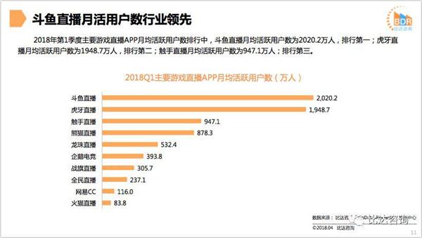 国内知名数据机构比达咨询(BigData-Research)近日发布了《2018年第一季度中国游戏直播市场研究报告》,报告显示,在2018年第1季度主要游戏直播APP月均活跃用户数排行中,斗鱼直播月均活跃用户数为2020.2万人,排行第一;虎牙直播月均活跃用户数为1948.7万人,排行第二;触手直播月均活跃用户数为947.1万人,排行第三。