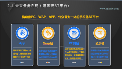 随着BT市场的火热以及游戏用户对BT手游产品的需求的日益旺盛,秒乐游戏于2017年6月开始成立BT手游发行和渠道联运业务。截至目前已成功分发数十款BT产品,取得了数百万的月流水成绩。并且已着手构建集PC、WAP、APP、公众号为一体的系统化BT平台-喵乐玩,目前喵乐玩APP已成功上线,并成功联运数百款BT手游产品,接下来秒乐游戏将会加大投入,凭借自身资金实力以及公会分发实力、深厚的GS运营实力,力争将喵乐玩平台打造成为BT界前三甲的平台。