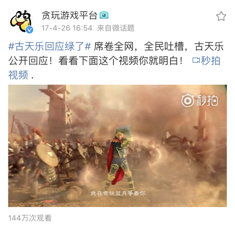 而掀起热度的背后推手——贪玩,随后更是以#古天乐回应绿了#发起微博话题,借势做了一次品牌营销,当时官方发布的这一广告视频观看量达到144万次,话题阅读量超过1500万,充分发挥了“明星效应”,为《贪玩蓝月》做了一次成功的游戏推广。