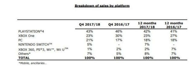 在平台方面,位居第一的PS4游戏在财年Q4收入占比43%(同比下滑3%),;位居第二的XBOX One游戏在财年Q4收入占比23%(同比下滑7%);而位居第三的PC游戏在财年Q4收入占比21%(同比上涨4%。由此可见,育碧在主机平台的游戏营收趋于下滑,而在PC平台的游戏营收出现小幅上涨。在财报的会议上,古利莫特也向投资者透露,育碧正在大举投资PC、手机游戏,以及以流媒体为代表的新游戏形式。