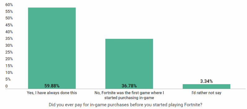 调查发现,《堡垒之夜》在吸引新用户方面效果显著。超过三分之一(36.78%)的付费玩家表示,自己是第一次在游戏中氪金。与此同时,59.88%的人表示,自己经常在游戏中氪金。