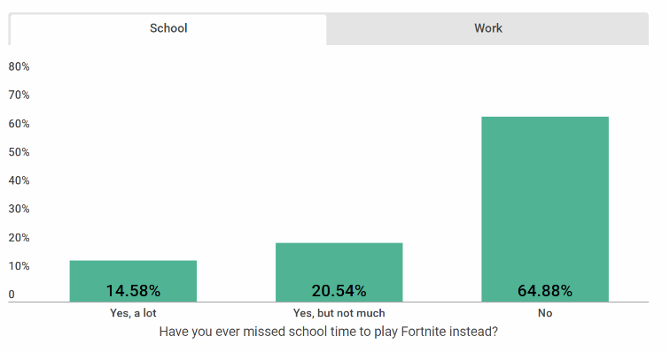 《堡垒之夜》风靡全球,甚至令不少人沉浸其中难以自拔。根据调查发现,对于那些仍在上学的受访者来说,有14.58%的人承认他们因为玩游戏而错过了上学时间。另外20.54%的人也这样做了,但没有那么多。而余下64.88%的学生则表示,从未因为玩游戏而耽误学业。