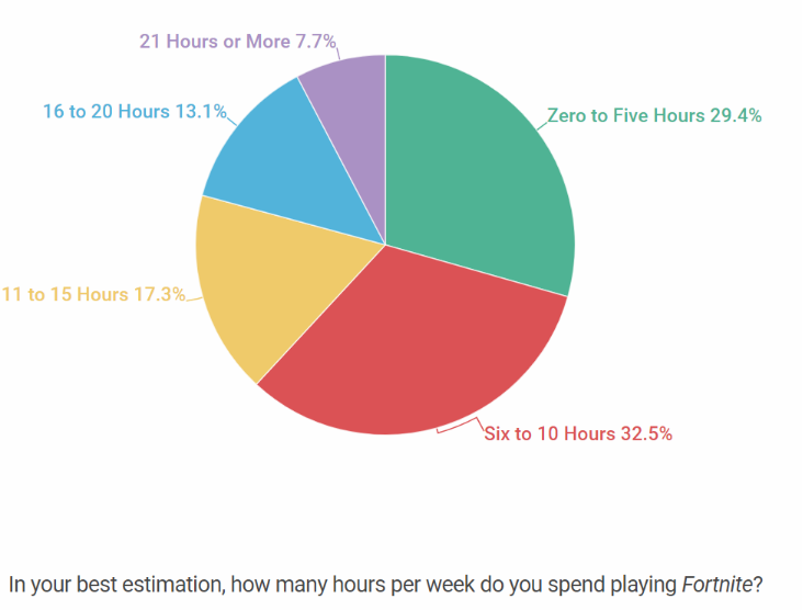 在时间游玩层面,根据对1000名玩家的调查,每周玩《堡垒之夜》最常见的时间是介于6到10个小时之间,这一比例达到了32.5%。另外17.3%的玩家表示他们每周平均玩11到15个小时。令人惊讶的是,13.1%的人表示每周玩16到20个小时,而余下7.7%的人则表示每周玩游戏时间达到了21个小时以上。此外,调查表明,《堡垒之夜》已不仅仅是一款热门游戏,更像一种社交方式。通过一起玩游戏,玩家实现了线上与线下相结合的社交需求。