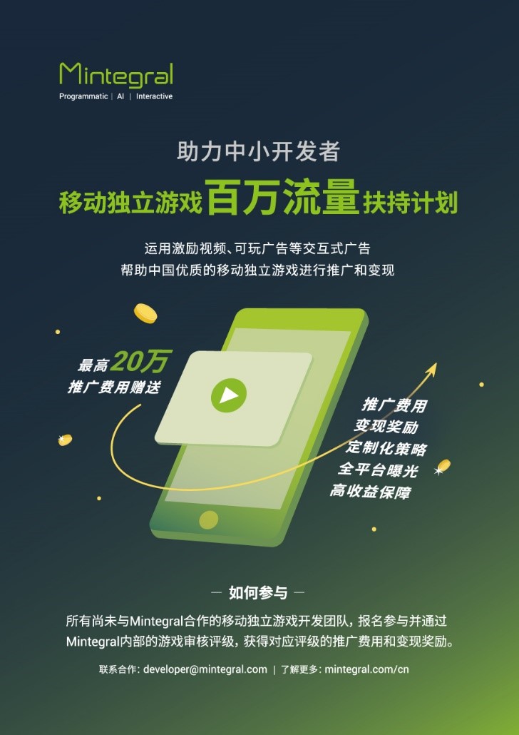 该项扶持计划主要针对中国地区的独立游戏开发者,所有尚未与Mintegral平台进行合作的独立游戏开发者团队均可参与。而凡报名参与该项计划的独立游戏,在通过Mintegral内部的审核评级后,将按照阶梯式规则,按不同评级给予不同比例的推广基金和广告变现收入奖励。Mintegral将通过激励视频、可玩广告等交互式广告为入选独立游戏实现高效的用户获取和广告变现。