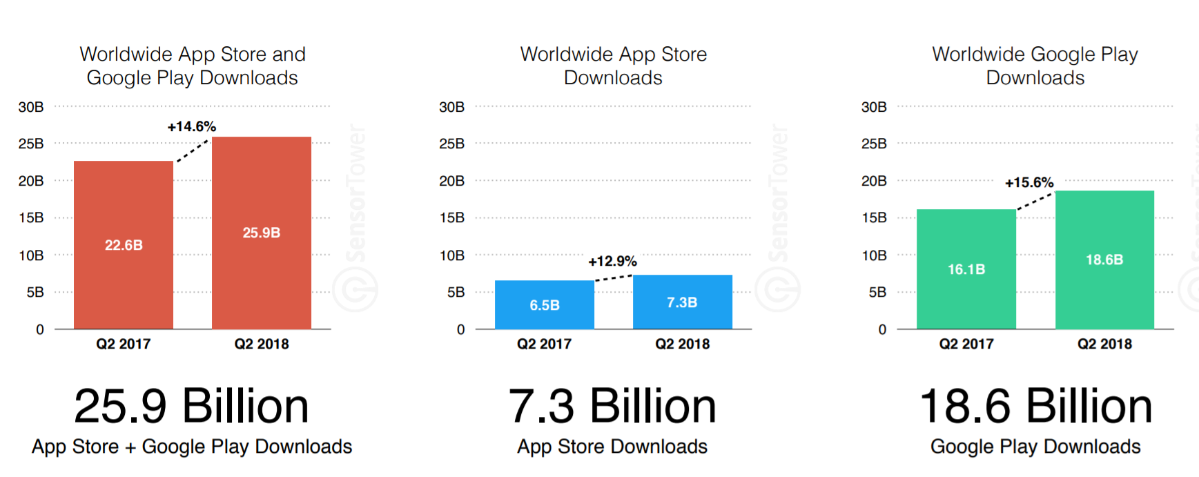 今天,Sensor Tower发布了2018年第二季度全球TOP10手游、应用及发行商榜单。报告显示,在2018年Q2,App Store 和Google Play 两大商店的首次应用下载总量达到了259亿次,高于去年同期的226亿次,同比增幅达到了14.6%。从单个平台的表现来看,Google Play 商店在下载量和增幅方面均领先于App Store。与App Store 的73亿次下载量相比,Google Play 的应用下载量达到了186亿次,同比增长了15.6%,而App Store 的增幅仅为12.9%。