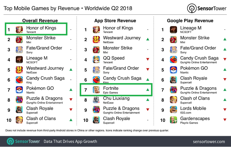 2018Q2全球手游收入榜:《堡垒之夜》挤进iOS收入榜第7,iOS单日收入达200万美元