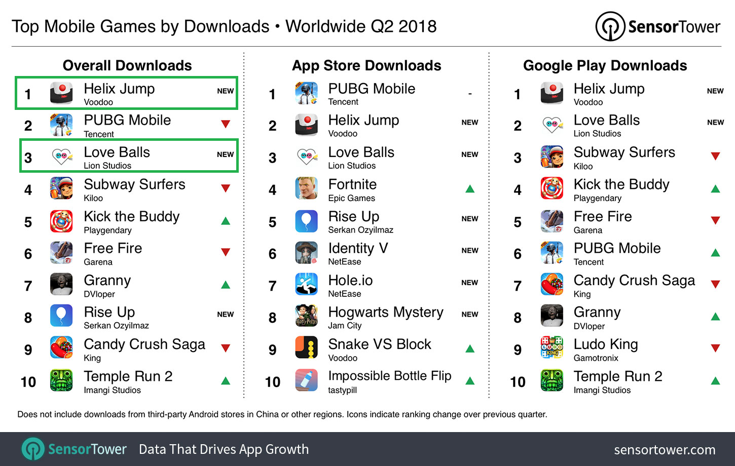 2018Q2全球手游下载榜:“小游戏之王”Voodoo《球跳塔》夺得桂冠,下载量突破1亿
