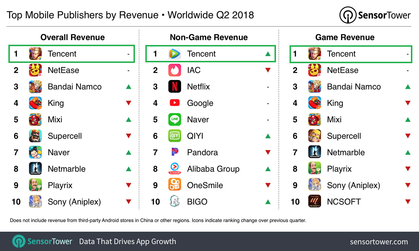 2018Q2全球移动应用发行商收入榜:手游收入占比高达77%,腾讯成最大赢家