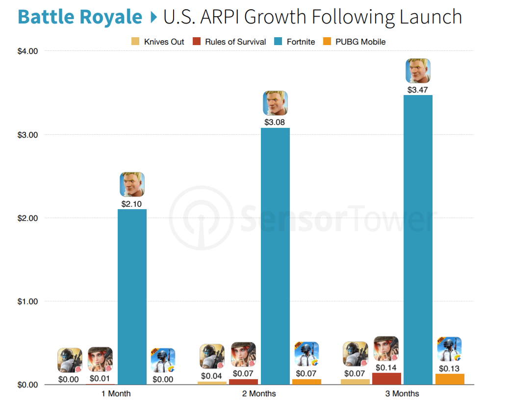 在发布3个月后,《堡垒之夜》在美国市场的每个安装的平均收入(ARPI)达到了3.47美元,远远高于其他竞争对手——《Knives Out》、《Rules of Survival》和《PUBG Mobile》的ARPI值分别为0.07美元、0.14美元和0.13美元。