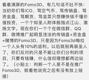 但回过头来看,Fomo3D的机制确实是一个“庞氏资金盘”,而且在区块链的加持下,它比传统的“庞氏骗局”更加公开透明、显而易见。但尽管这样,国内不少从业者还是大力推广,除了是由于对区块链技术的热爱之外,更多的可能是一些更“现实”的原因。