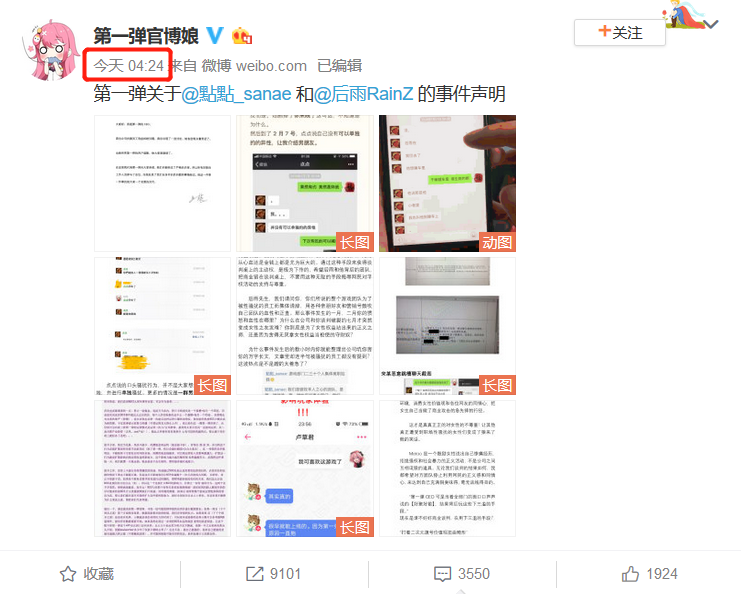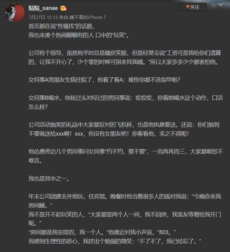 第一个和游戏圈有点儿关系。周五下午,二次元社区网站第一弹的员工@點點_sanae发布了一条关于“公司领导性骚扰”的微博: