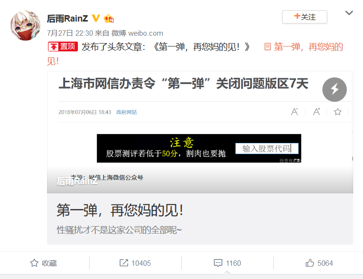 接着到了晚上,同样是第一弹员工的@后雨RainZ发布了微博文章《第一弹,再您妈的见!》,表示“性骚扰才不是这家公司的全部呢~”,在声援@點點_sanae的同时,就“上海网信办责令第一弹关闭问题版区7天”的消息爆出众多关于公司的黑料。