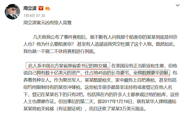 简单回顾一下事件:2017年1月20日,“海派清口”的创始人周立波在美国被捕,涉嫌非法持枪和藏毒。到了今年6月,周立波的案子终于宣判,周立波因“开车打手机”被判交通违章罚款150美元,其他所有的指控都不成立,法官判周立波无罪。7月,周立波微博发表长文回顾事件,表示自己是被陷害的,将陷害自己的人称为“某某”。