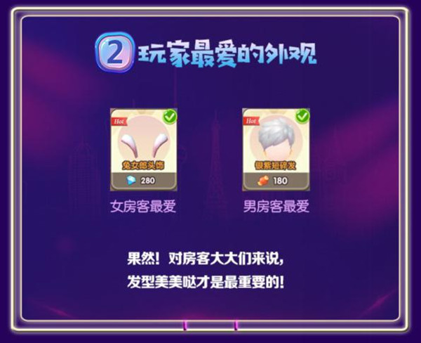 游戏内设置了丰富的外观系统,上百种服装武器让人眼花缭乱。然而在外观的选择上,房客们似乎达成了共识!那就是发型美美哒才是最重要的事情——当美嘉、一菲、悠悠带上萌萌的兔耳朵,简直可爱满分,让人无法抵抗!而酷酷的白发造型则深得男房客喜爱。