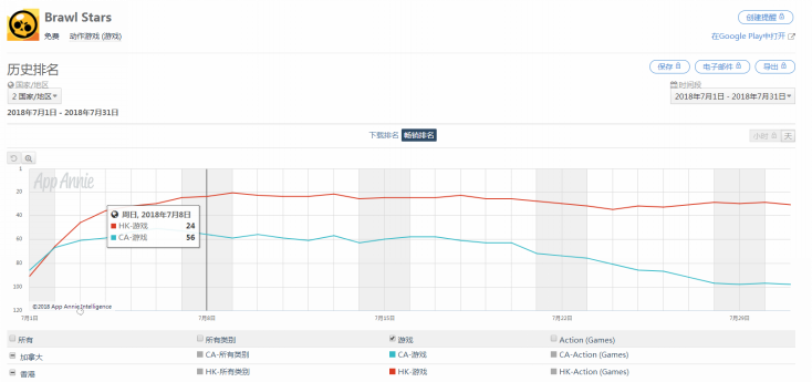 根据App Annie的数据,《荒野乱斗》7月在香港地区的成绩尤为亮眼,基本徘徊在畅销榜TOP30。相比之下,加拿大地区的表现稍显逊色,仅排在畅销榜TOP50至TOP100之间。
