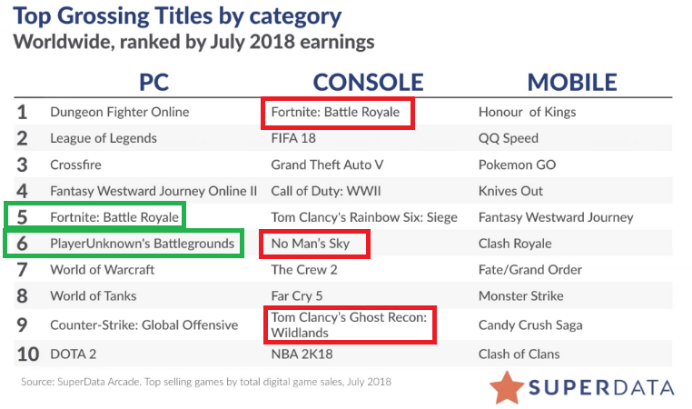 在主机游戏方面,最令人惊讶的是,曾经饱受诟病的《无人深空》开始出现逆转。在7月,该作在PC、PS4以及XboxOne平台的累计总收入达到了2400万美元,活跃玩家人数也超过了200万——这一数据是上个月的10倍。整体来说,该作在7月的强劲表现创下了自2016年8月(首发月)以来最好的月度成绩。