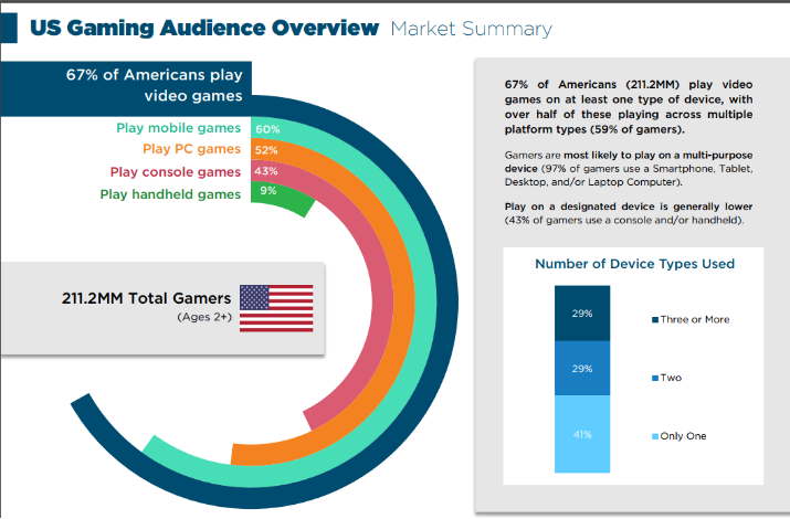 报告显示,在美国,视频游戏玩家的占比为67%。这也意味着,超过2.11亿的美国人口在游玩视频游戏。其中,移动游戏玩家占比为60%。移动游戏是美国玩家最常见的游戏形式,通常占据玩家每周一半的时间。究其原因,主要是大部分玩家都拥有一台移动设备,并且方便携带、体验良好。相比之下,PC和主机游戏对玩家的吸引力稍显逊色,玩家占比分别为52%、43%。报告指出,PC游戏的受众主要是休闲玩家及核心玩家。而对于寻求以动作游戏为核心体验的玩家来说,主机游戏则是他们的首要选择。此外,掌机游戏玩家和其他设备的玩家占比均为9%。报告指出,掌机游戏玩家的游玩范围较广,喜欢在便携设备上体验传统游戏。