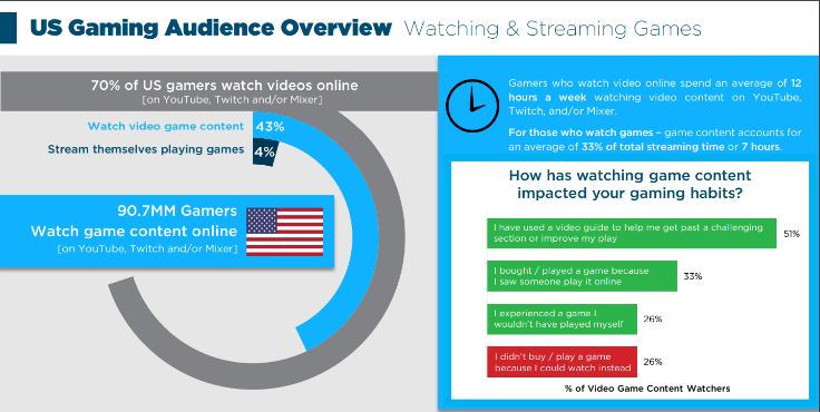 在观看时长方面,美国玩家平均每周花费12个小时观看YouTube、Twitch上的视频内容。其中,游戏视频内容占据了7个小时,占所有视频内容的33%。